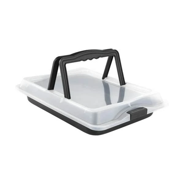 Bradepanden har et smart låg med håndtag, som du let spænder fast henover formen, så kagen er godt beskyttet og nem at transportere.
