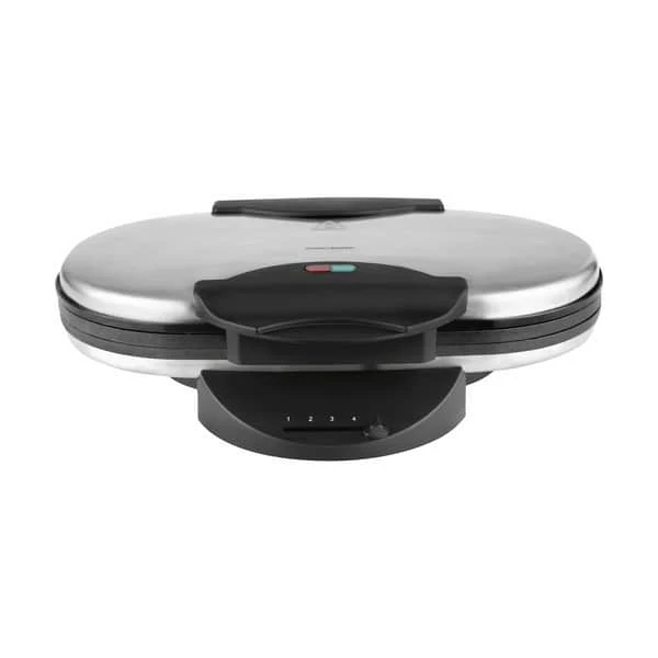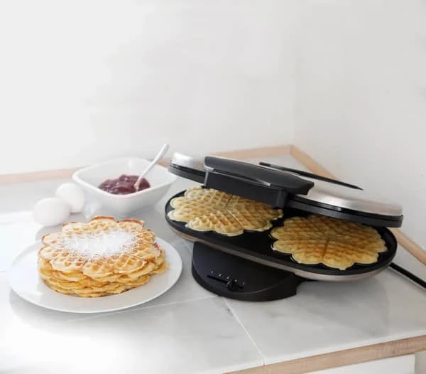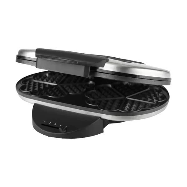 Er der altid en i familien, der skal vente på en lækker, sprød vaffel? Med Cook & Baker dobbeltvaffeljern kan du lave 2 x 5 hjerteformede vafler på én gang, så der er rigeligt med vafler til alle – eller dobbelt så mange til dig, når du er lækkersulten efter en god vaffel. Vaffeljernet er belagt med Super-Slip Sølv non-stick belægning, justerbar termostat og kontrollampe, der viser, hvornår vaffeljernet er klar til brug.