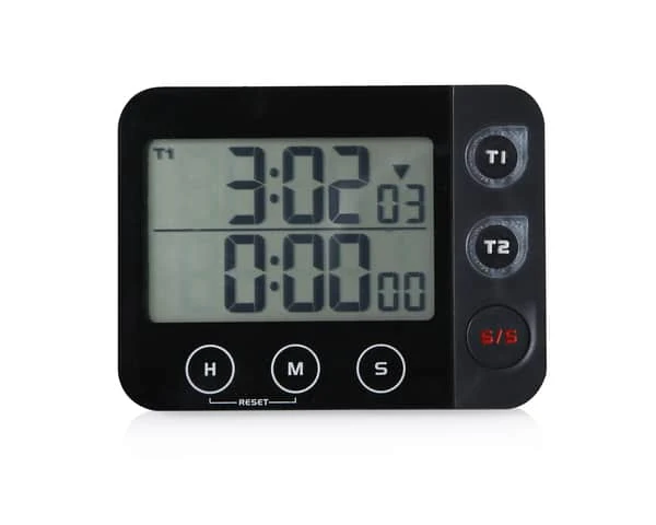Du kan indstille Cook & Baker minuturet med to ringetider – én til stegen og én til kartoflerne. Minuturet er let at betjene med få knapper og du kan både se timer, minutter og sekunder på det store display. Desuden har uret magneter på bagsiden, så du kan hænge det op på køleskabet.