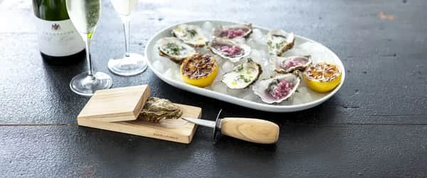 Østerskniven fra Cook & Baker med den tilhørende holder i træ gør det let som en leg at åbne østers, som ellers kan være drilske og smutte mellem hænderne.