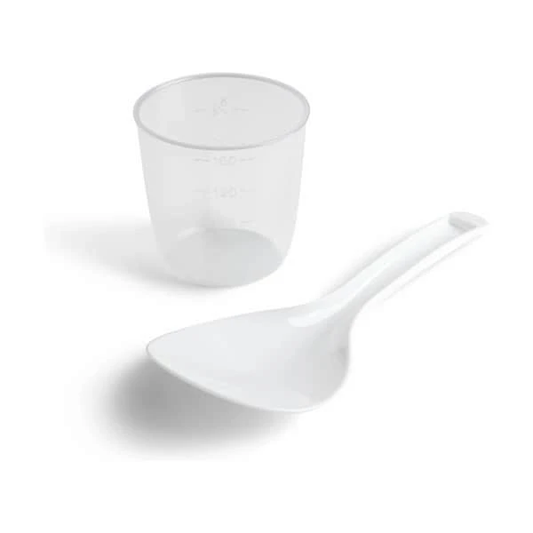 Du får et målebæger og ske med til riskogeren, så du er godt gearet til den store risret. Skålen tåler opvaskemaskine.