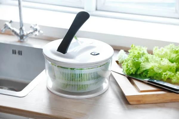 Slip for slatten og våd salat i salatskålen med Cook & Baker salatslynge. Salatslyngen har topstyret pumpefunktion, så den er let at betjene.